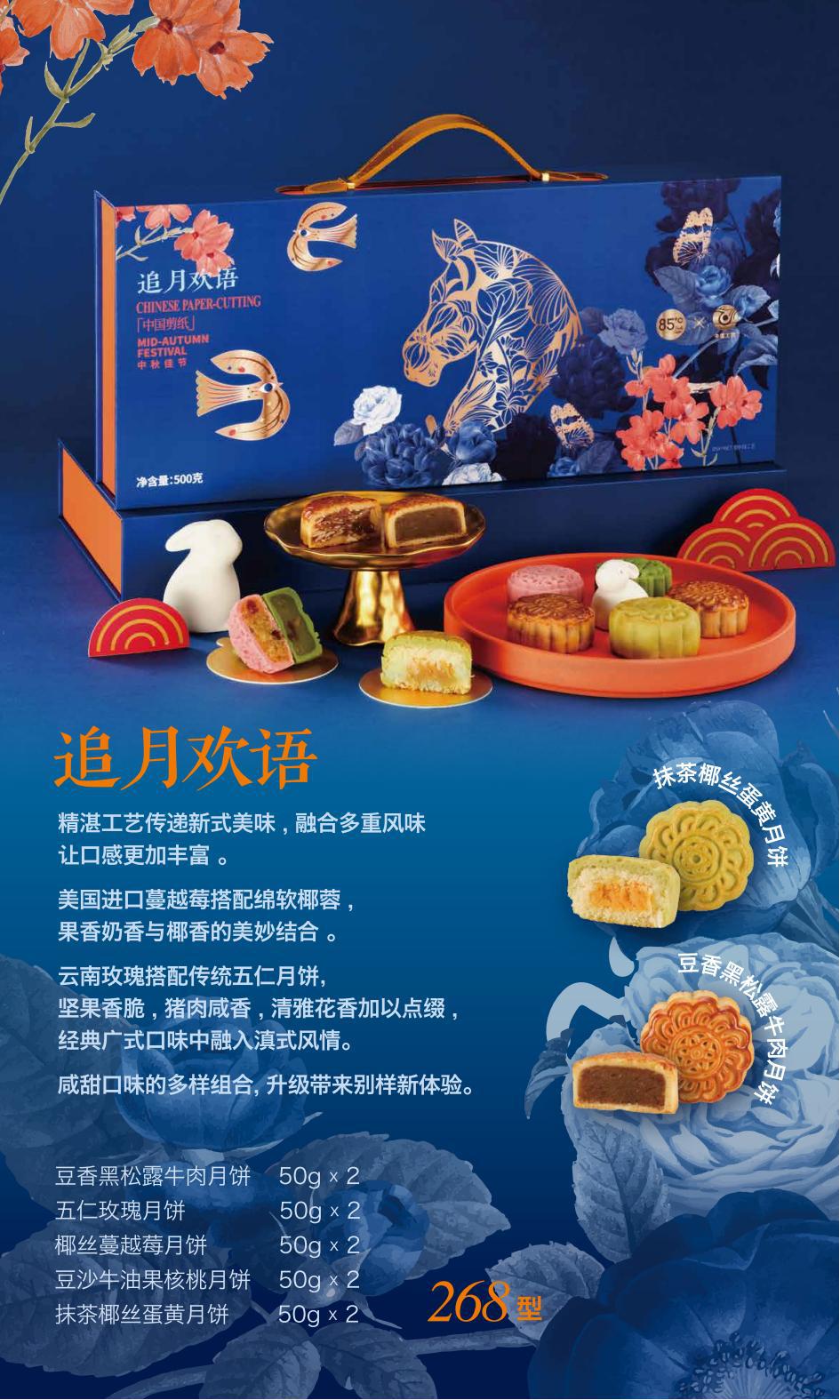 介紹:五仁玫瑰月餅50g*2 椰絲蔓越莓月餅50g*2 豆沙牛油果核桃月餅50g*2 豆香黑松露牛肉月餅50g*2 斑斕椰絲蛋黃月餅50g*2