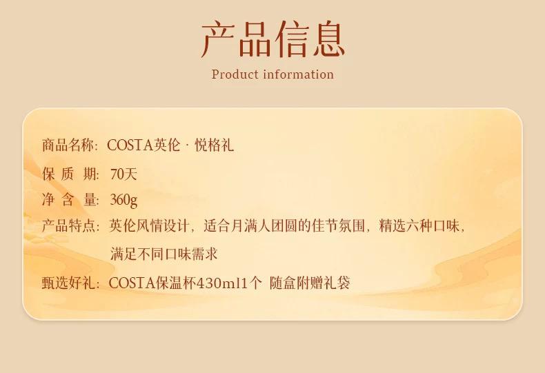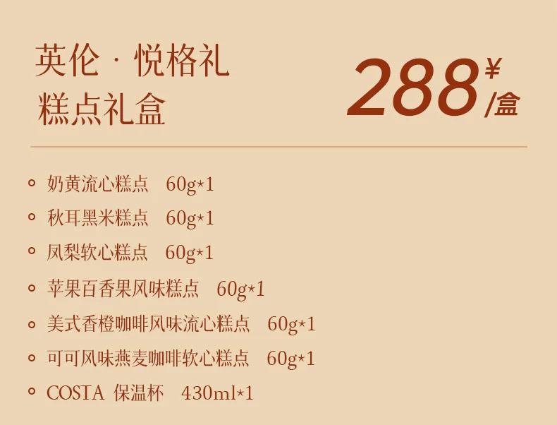 介紹:奶黃流心糕點60g*1 美式香橙咖啡風味流心糕點60g*1 可可風味燕麥咖啡軟心糕點60g*1 蘋果百香果風味糕點60g*1 鳳梨軟心糕點60g*1 秋耳黑米糕點60g*1 COSTA 保溫杯430ml*1
