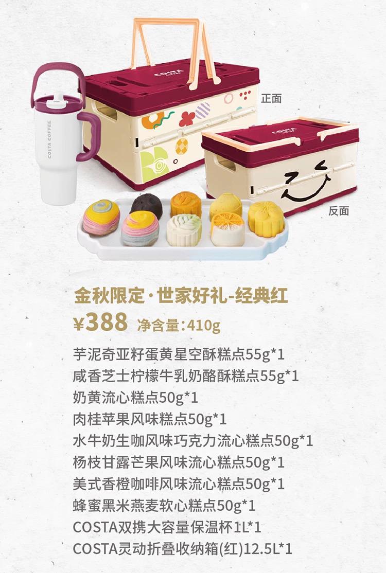 介紹:芋泥奇亞籽蛋黃星空酥糕點55g*1 咸香芝士檸檬牛乳奶酪酥糕點55g*1 奶黃流心糕點50g*1 肉桂蘋果風(fēng)味糕點50g*1 水牛奶生咖風(fēng)味巧克力流心糕點50g*1 楊枝甘露芒果風(fēng)味流心糕點50g*1 美式香橙咖啡風(fēng)味流心糕點50g*1 蜂蜜黑米燕麥軟心糕點50g*1 COSTA雙攜大容量保溫杯1L*1 COSTA靈動折疊收納箱(紅)12.5L*1