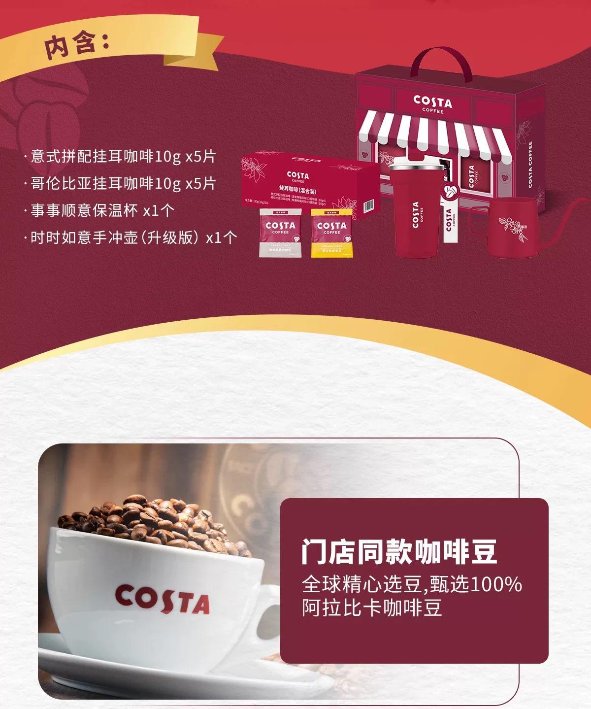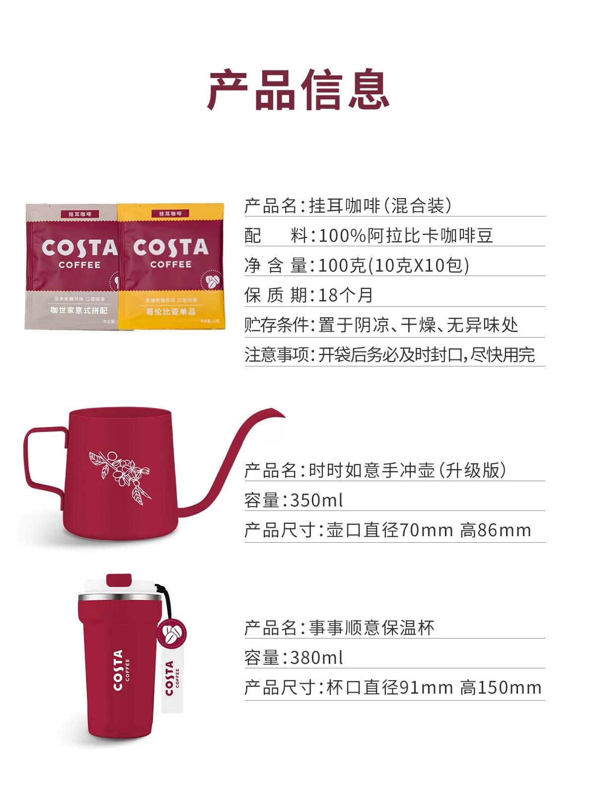 介紹:意式拼配掛耳咖啡1盒(10g*5) 哥倫比亞掛耳咖啡1盒(10g*5) “事事順意”保溫杯 *1 “時時如意”咖啡手沖壺 *1