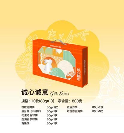 介紹:蛋黃紅蓮月餅80克*1粒 醇香粒粒棗肉餅80g*2粒 蛋月燒(山楂味) 80g*1 奇亞籽花生餅 80g*1 荔浦香芋餅 80g*1 百果月餅 80g*2 粒粒紅豆沙月餅 80g*2