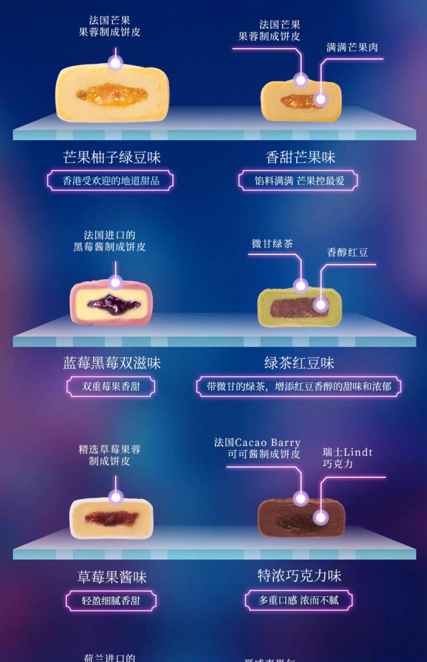 介紹:芒果柚子綠豆味*1 芒果味*1 藍莓黑莓雙滋味*1 綠茶紅豆味*1 草莓果醬味*1 特濃巧克力味*1 夏威夷果仁芝麻*1味 粉紅番石榴*1 杏肉果醬味*1