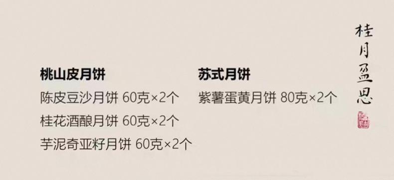 介紹:桃山皮月餅 陳皮豆沙月餅60克x2個 桂花酒釀月餅60克x2個 芋泥奇亞籽月餅60克x2個 蘇式月餅 紫薯蛋黃月餅80克x2個