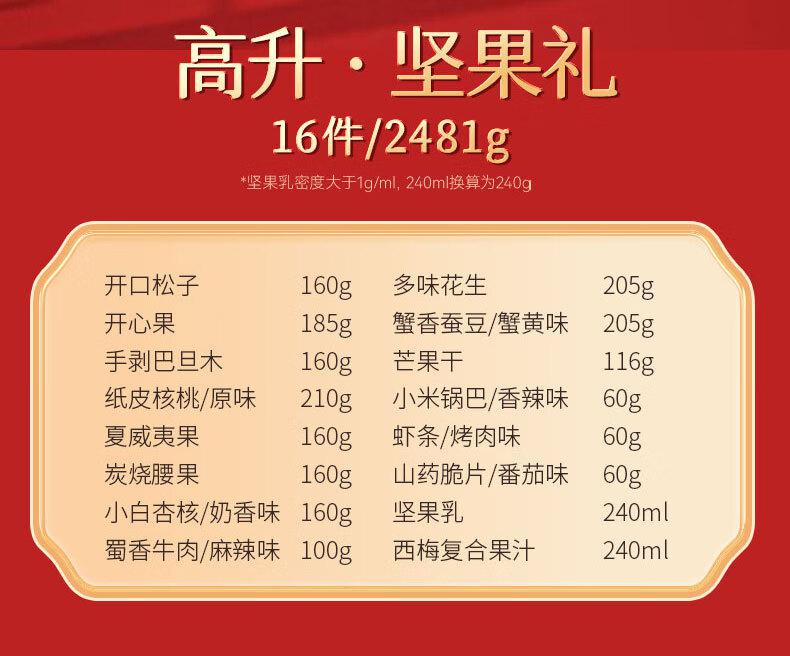 介紹:開口松子160g 多味花生205g 開心果185g 蟹香蠶豆/蟹黃味205g 手剝巴旦木160g 芒果干116g 紙皮核桃/原味210g 小米鍋巴/香辣味60g 夏威夷果160g 蝦條/烤肉味60g 炭燒腰果160g 山藥脆片/番茄味60g 小白杏核/奶香味160g 堅果乳240ml 蜀香牛肉/麻辣味100g 西梅復合果汁240ml